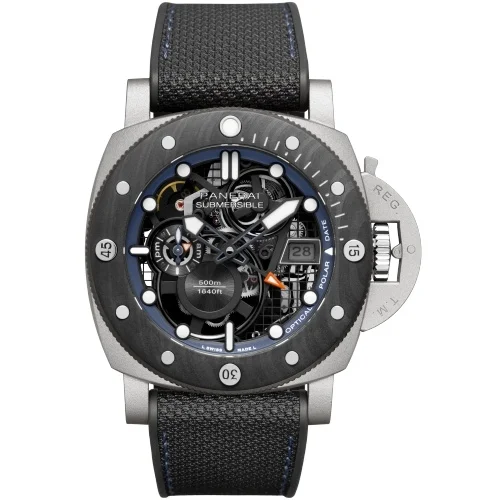 Tecnicamente, il PAM01670 trasporta il diametro di 47 millimetri – una misura dichiaratamente massiccia che garantisce leggibilità anche in condizioni di pressione idrostatica estrema e con equipaggiamento completo di muta e guanti. La cassa combina titanio e Carbotech, un materiale composito aerospaziale derivato dalla fibra di carbonio che riduce il peso specifico mantenendo una resistenza agli urti e alla corrosione salina ineguagliabile. Il movimento interno è il caliber Panerai P.4001/S, un meccanismo a carica automatica dotato di la riserva di marcia estesa e di una complicazione rara per il segmento subacqueo: la lancetta aggiuntiva delle 12 ore e quella delle 24 ore, entrambe fisse. Questa configurazione consente al subacqueo di tracciare simultaneamente il tempo locale, il tempo di decompressione e il ciclo circadiano – una necessità concreta nelle immersioni profonde e prolungate. La data, posizionata a tre ore, si legge senza ambiguità anche attraverso il vetro satinato della cassa.