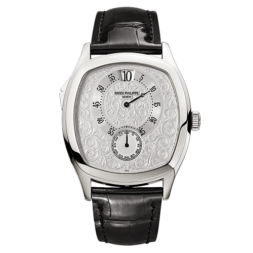 Il cuore del 5275P batte al ritmo del calibro Patek Philippe 32-650 HGS PS, un movimento manuale che combina tre funzioni di complicazione in una densità costruttiva straordinaria: il minuterie (ore e minuti a salto), i secondi a salto e il carillon acustico a ore. Ogni meccanismo è indipendente e sincronizzato attraverso una serie di cammelli, bilancieri e assi che giustificano 803 componenti e un'altezza totale di 4,24mm. La cassa in platino 950 misura 39,80mm di diametro e 10,6mm di spessore, con il fondello trasparente che svela la complessità costruttiva del movimento. Il quadrante nero o argentato è ornato da lance dorate e indici applicati che rimandano alla simbologia dell'orologeria d'epoca, mentre la corona a vite garantisce la sigillatura fino a 30 metri d'acqua — una profondità raramente sfruttata da un orologio di questa categoria.