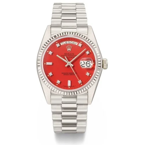 Il Rolex Day-Date 36 rappresenta da oltre cinquant'anni l'orologio di riferimento per chi comprende che la vera eleganza non si proclama, si riconosce. L'18039 Stella Red incarna questa filosofia nella sua forma più pura: una cassa in oro bianco da 36 millimetri, una lunetta liscia, un quadrante in lacca rossa con i caratteristici indici stella—la versione più ambita dai collezionisti che cercano l'autenticità costruttiva senza concessioni al compromesso estetico. Prodotto negli anni Settanta, quando Rolex aveva già consolidato tre decenni di maestria orologiera, questo modello non rappresenta semplicemente un orologio di lusso, ma un documento materiale di come la manifattura svizzera interpretasse la perfezione: proporzioni armoniose, finiture sobrie, una presenza discreta ma inconfondibile al polso.