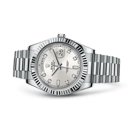 Il movimento che anima il 218239 è il calibro Rolex 3156, un meccanismo a carica automatica con frequenza di 28.800 oscillazioni al secondo, certificato Chronometer da organismi indipendenti. Il numero di rubini (31) e la costruzione del bilanciere garantiscono stabilità termica e affidabilità certificata, caratteristica che ha reso il Day-Date sinonimo di precisione nei contesti dove l'affidabilità è questione di credibilità. La cassa in oro bianco 950 (lega con 95% di platino) non è una scelta estetica casuale: il bianco freddo amplifica la leggibilità della quadrante in termini di contrasto, mentre il peso e la densità dell'oro bianco forniscono quella sensazione tattile di solidità che distingue un segnatempo di lusso autentico da una mera rappresentazione. Lo spessore di 13,5mm mantiene il 218239 compatto nonostante il diametro, aspetto fondamentale per il comfort sotto la manica di una camicia di fresco lino o cotone.