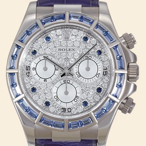 Dal punto di vista tecnico, il 116589saciI monta il calibro Rolex 4130, un movimento colonna a colonna completamente sviluppato in casa. Questo calibro eroga 4130 oscillazioni al secondo (una frequenza standard per i cronografi meccanici moderni) e garantisce una precisione cronometricamente certificata. Il quadrante è disponibile in versione ghiacciata — una finitura che diffonde uniformemente la luce sulle faccette sfaccettate dei diamanti — oppure in versioni opache. La cassa raggiunge i 40 millimetri di diametro, una misura che non teme di farsi notare al polso, mentre lo spessore si attesta intorno ai 12,5 millimetri. L'oro bianco 18 carati utilizzato per cassa, lunetta e bracciale raggiunge una purezza del 750 millesimi, uno standard che Rolex mantiene coerentemente su tutta la collezione Daytona preziosa. La resistenza all'acqua è dichiarata a 100 metri, sufficiente per un orologio di questa categoria — non è un subacqueo, è un cronografo da polso e da occasione.