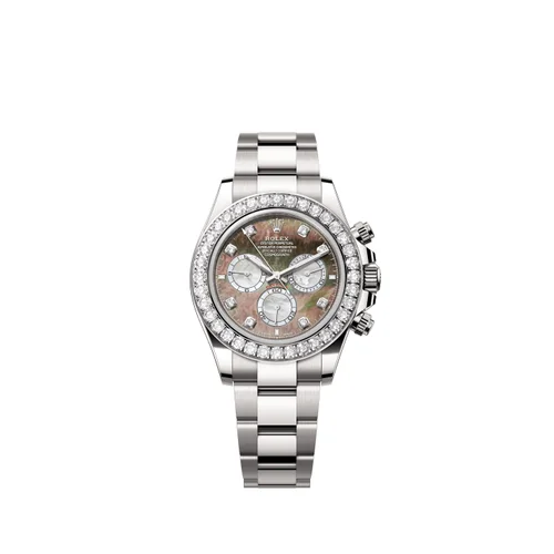 Sotto il fondello bianco satinato alloggia il Rolex Calibre 4131, movimento cronografico in oro bianco a carica automatica con meccanica colonna-ruota che garantisce il recupero istantaneo della lancetta cronografica. Il diametro della cassa è di 40 millimetri, il rapporto di proporzionalità mantiene l'equilibrio classico del Daytona pur conferendo una presenza moderna al polso. La profondità è di 12,35 millimetri; il peso complessivo in oro bianco determina una massa tangibile che contraddistingue la qualità costruttiva senza risultare invadente. La resistenza all'acqua raggiunge 100 metri, certificazione che sottolinea la vocazione sportiva anche in questa incarnazione gemmifera. La lunetta in ceramica Cerachrom, sottile quanto permettono i diamanti, mantiene la precisione di fabbrica e non scivola durante la regolazione dei tempi.