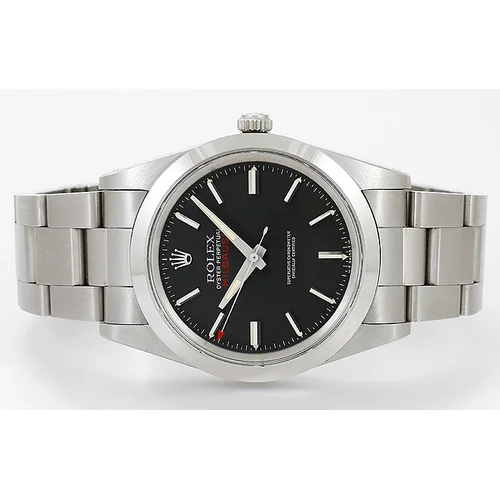 Il movimento Rolex caliber 1580 è un'evoluzione del caliber 1560, dotato del sistema Parachrom blue (spirale in niobio-zirconio) e bilanciere Microstella che garantiscono stabilità magnetica eccezionale anche in ambienti ostili. Il cronometro COSC-certificato assicura precisione entro ±6 secondi al giorno. La cassa Oyster misura 38 mm di diametro, 11 mm di spessore, con spalle arrotondate caratteristiche che permettono una distribuzione ergonomica sul polso. Il fondo è dotato di tondello con incisione referenziale, segno di autenticità e tracciabilità costruttiva. L'assenza di lunetta girevole enfatizza la purezza geometrica del design: il quadrante nero o argento, entrambi con applique dei numeri in oro o argento a contrasto, comunica sobrietà tecnica senza cedimenti stilistici. Gli indici bastoncino sono sagomati con precisione svizzera, i calcoli di luminescenza permettono lettura anche in condizioni di visibilità compromessa.